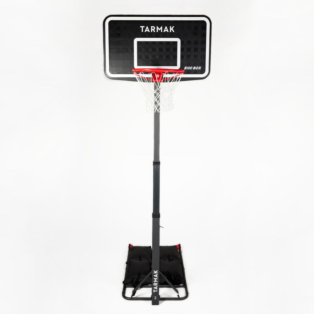 El tablero de plástico (polietileno) es de alta densidad (38 mm), ¡preparado para tus primeras canastas! La estabilidad está garantizada gracias a las 4 bolsas de lastre, que deben llenarse con agua o, preferiblemente, con arena.
