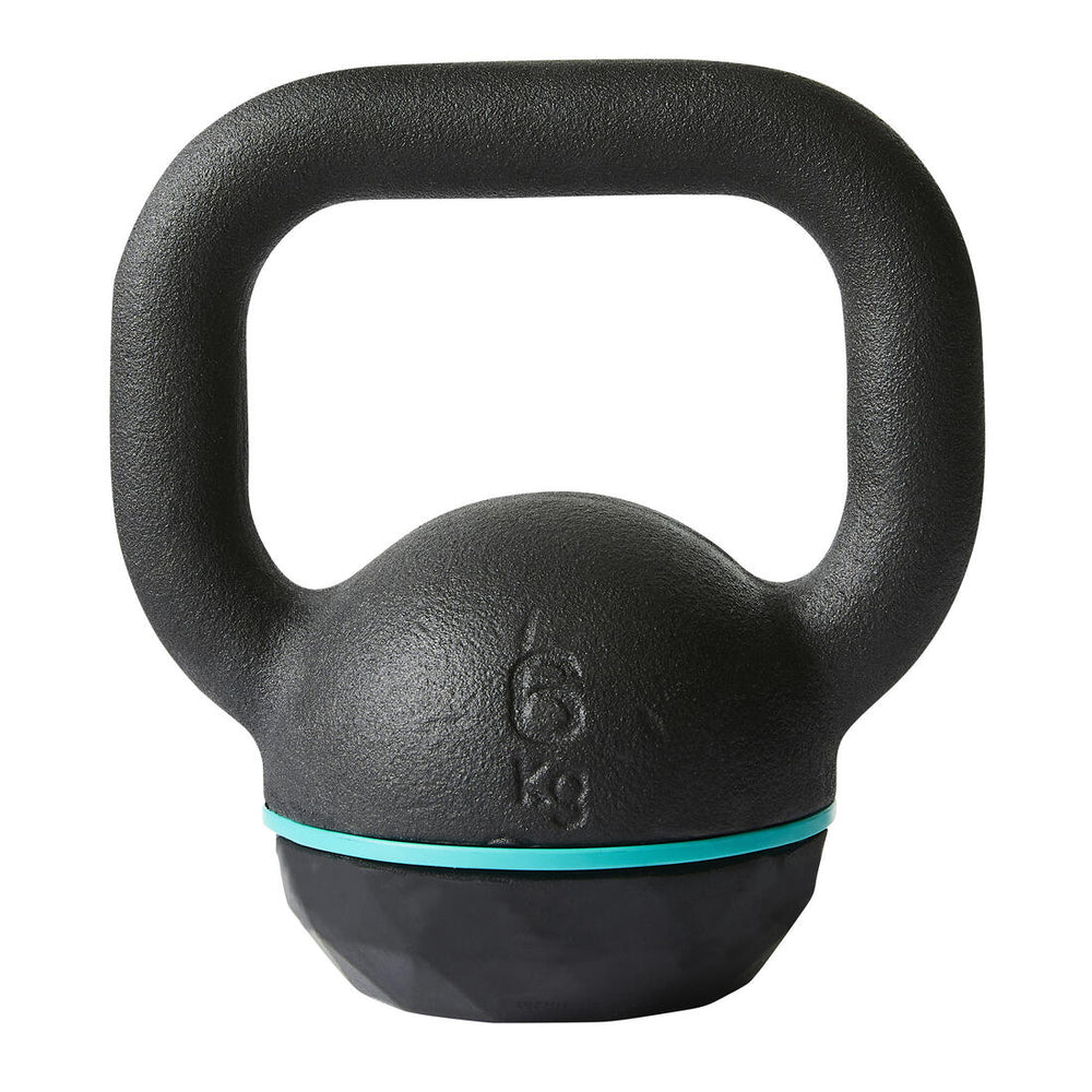 Kettlebell de 6 kg con base de goma resistente para proteger el suelo de los impactos. Agarre ergonómico con empuñadura ancha. Facilita el agarre con 1 o 2 manos en función del ejercicio.