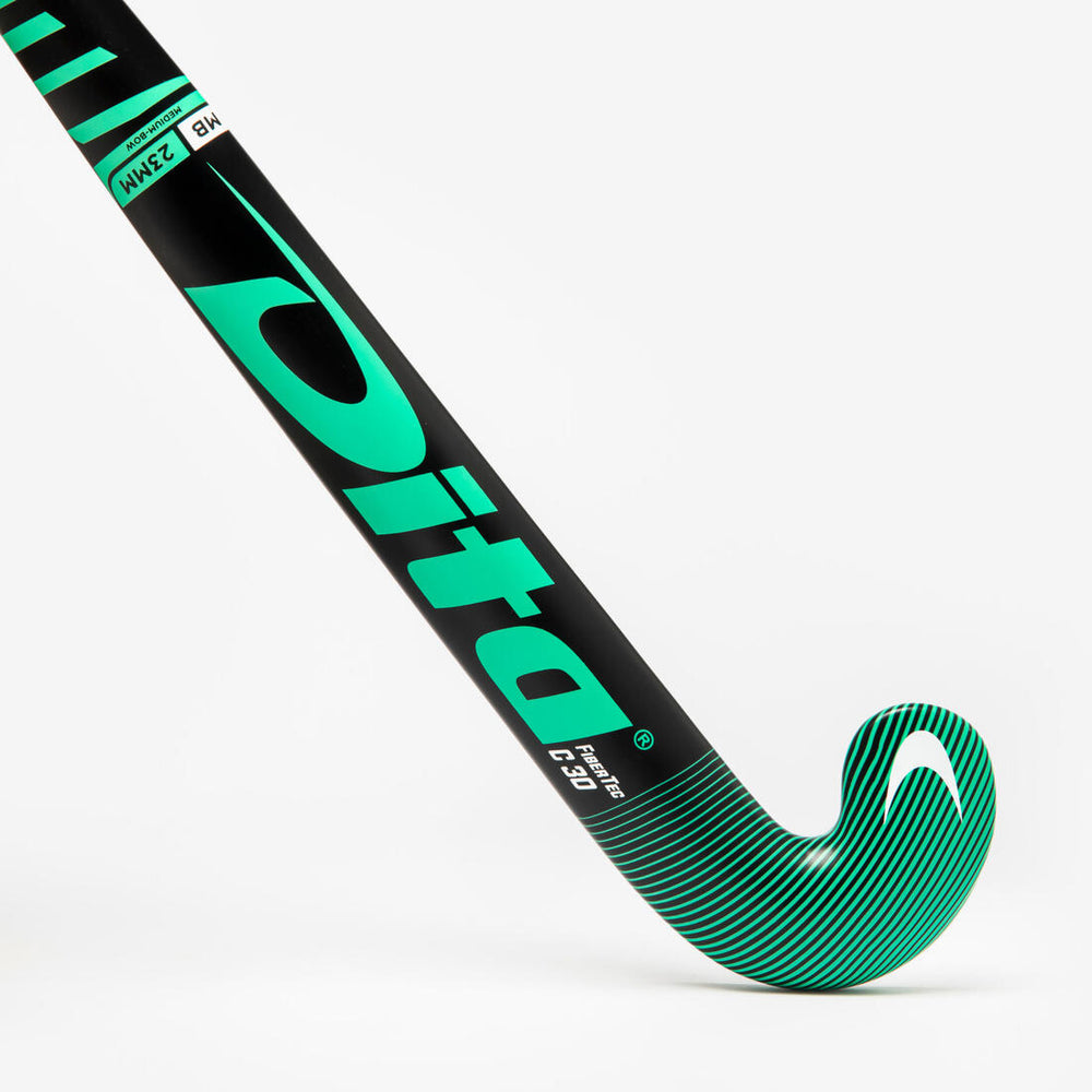 Según las normas de la FIH, el punto de curvatura máximo de un stick de hockey sobre hierba debe estar situado como mínimo a 200 mm del punto más alto de la pala del stick y la altura de curvatura máxima es de 25 mm.