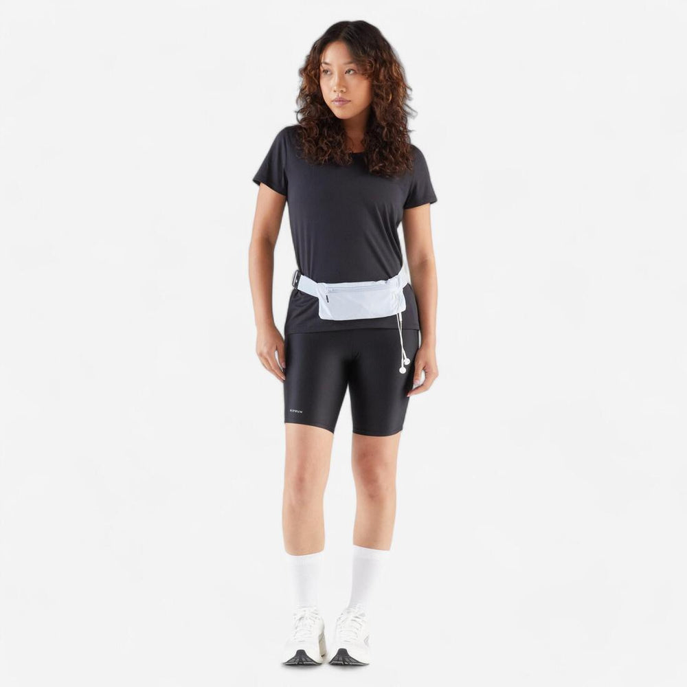 Cuando el cinturón de running esté lleno, recomendamos ajustarlo y llevarlo en la cadera. Esto garantiza estabilidad y una sujeción óptima. Este cinturón deportivo de running se puede llevar delante o detrás según tus hábitos y tus sensaciones. Recomendamos colocar el cinturón sobre un tejido.