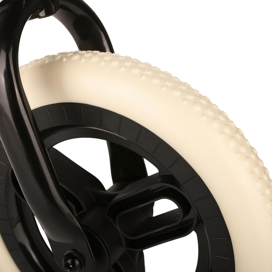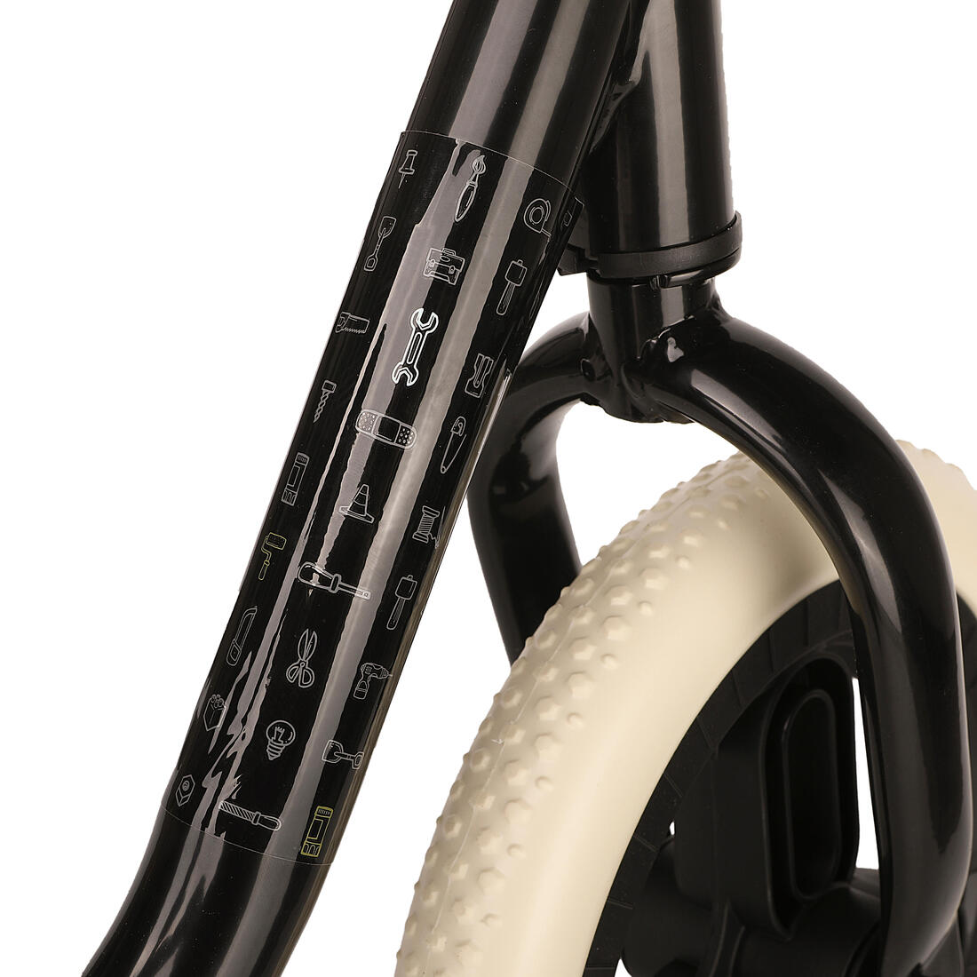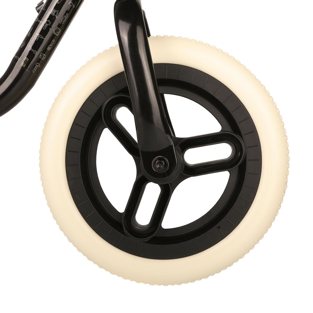 Cuadro: acero Manillar: acero, longitud 390 mm, diámetro 19 mm. puño: polímero SEBS, longitud 90 mm. tija de sillín: acero, longitud 218 mm, diámetro 22,2 mm. sillín: espuma de polipropileno, longitud 195 mm, anchura 124 mm. llanta: plástico neumático: espuma EVA, tamaño 10" rodamientos: cojinete