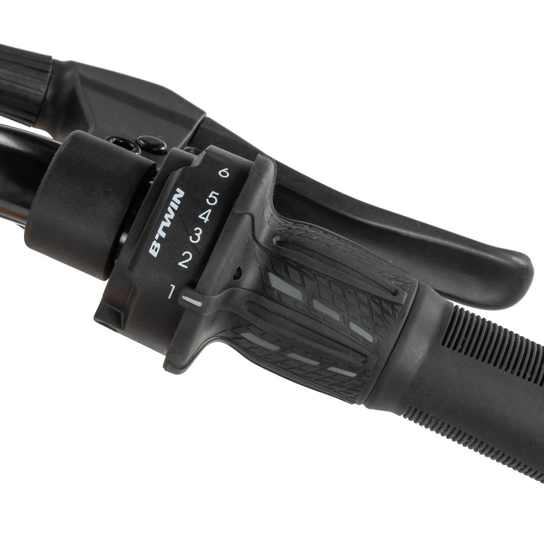 6 velocidades. Palanca muy suave para niños. El paso de velocidades se efectúa mediante puño giratorio, más fácil y seguro (el niño no suelta el manillar para cambiar de velocidades). B'TWIN ha seleccionado esta palanca porque su tamaño y su suavidad han sido especialmente concebidos para las manos de los niños.