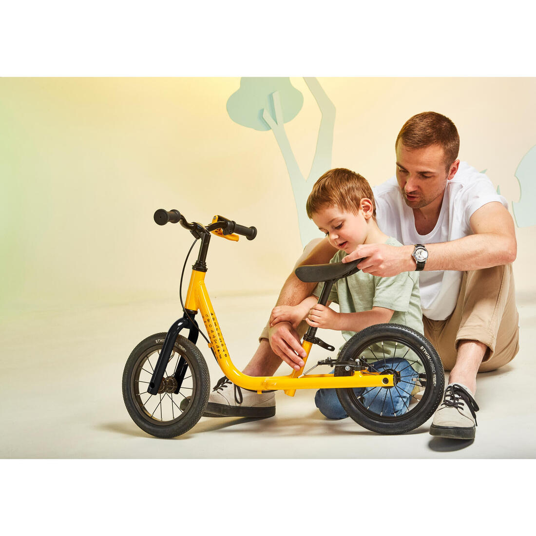 Cada componente ha sido concebido específicamente por nuestro equipo BTWIN. El cuadro bajo ayuda al niño a subir y bajar fácilmente y facilita el cruce de obstáculos (aceras, pendientes). El reposapiés le invita a levantar los pies y por lo tanto a jugar con su equilibrio. La posición del reposapiés le prepara para poner los pies en el lugar correcto cuando use una bici con pedales. Finalmente, el sillín es más alto en la parte posterior para que el niño tome apoyo y se propulse eficazmente.