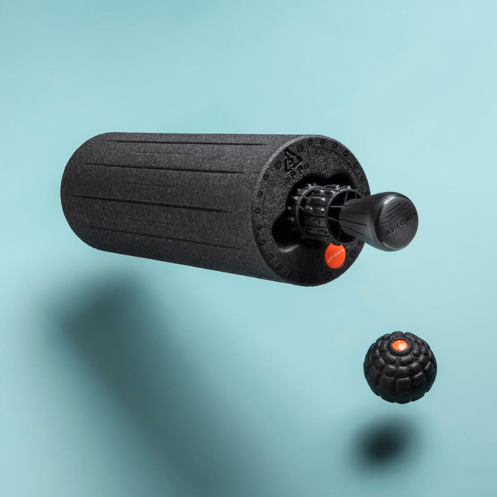 El kit descubrimiento incluye 1 rodillo liso (38 x 13,5 cm), 1 pelota y 1 bastón para realizar masajes completos en todo el cuerpo. La pelota y el bastón se guardan dentro del rodillo.