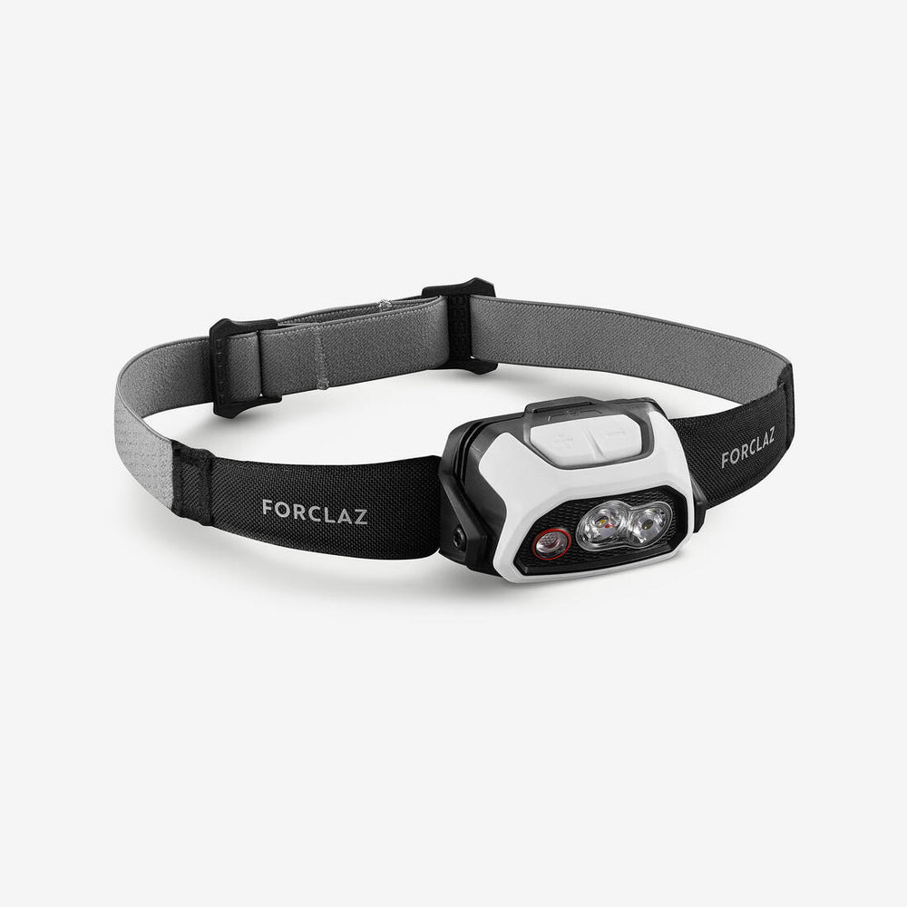 La linterna frontal FORCLAZ HL900 USB dispone de 3 haces. Haz de luz roja, muy ancho para ser discreto y ver a muy corta distancia (refugio). Haz ancho de luz cálida para ver bien delante y a los lados a corta y media distancia. Haz de luz concentrado de luz fría para ver lejos.